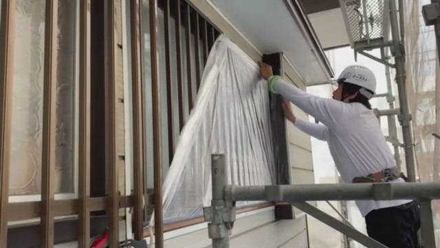 窓ガラスや玄関ドア、植栽など塗料が付着しては困る部分を覆います。飛散防止シートも足場周りに掛け、近隣への塗料飛び散りに配慮します。