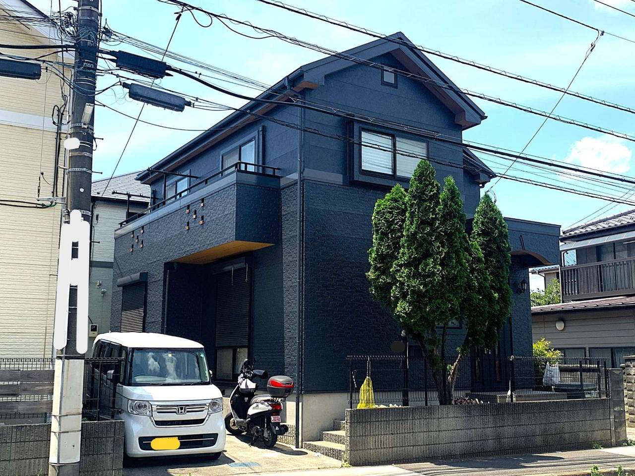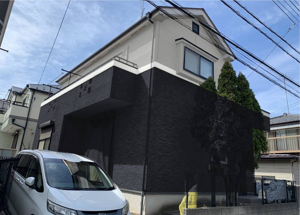 H様邸では、奥様の憧れだったブラック色の外壁色を実現。カラーシュミレーションや塗り板見本で、さまざまなブラック色を検討し、現在の深みのあるブラック色をセレクト。日の当たり方でネイビーにも見える、深みのあるブラックに、茶色い軒天を合わせることで、モダンで上品な印象のお住まいに生まれ変わりました。ブラック色は紫外線劣化を受けやすいため、高耐久な無機系塗料で外壁塗装をしました。お客様は、長い期間、素敵なお家で暮らしていけることをとても喜んでいらっしゃいました。