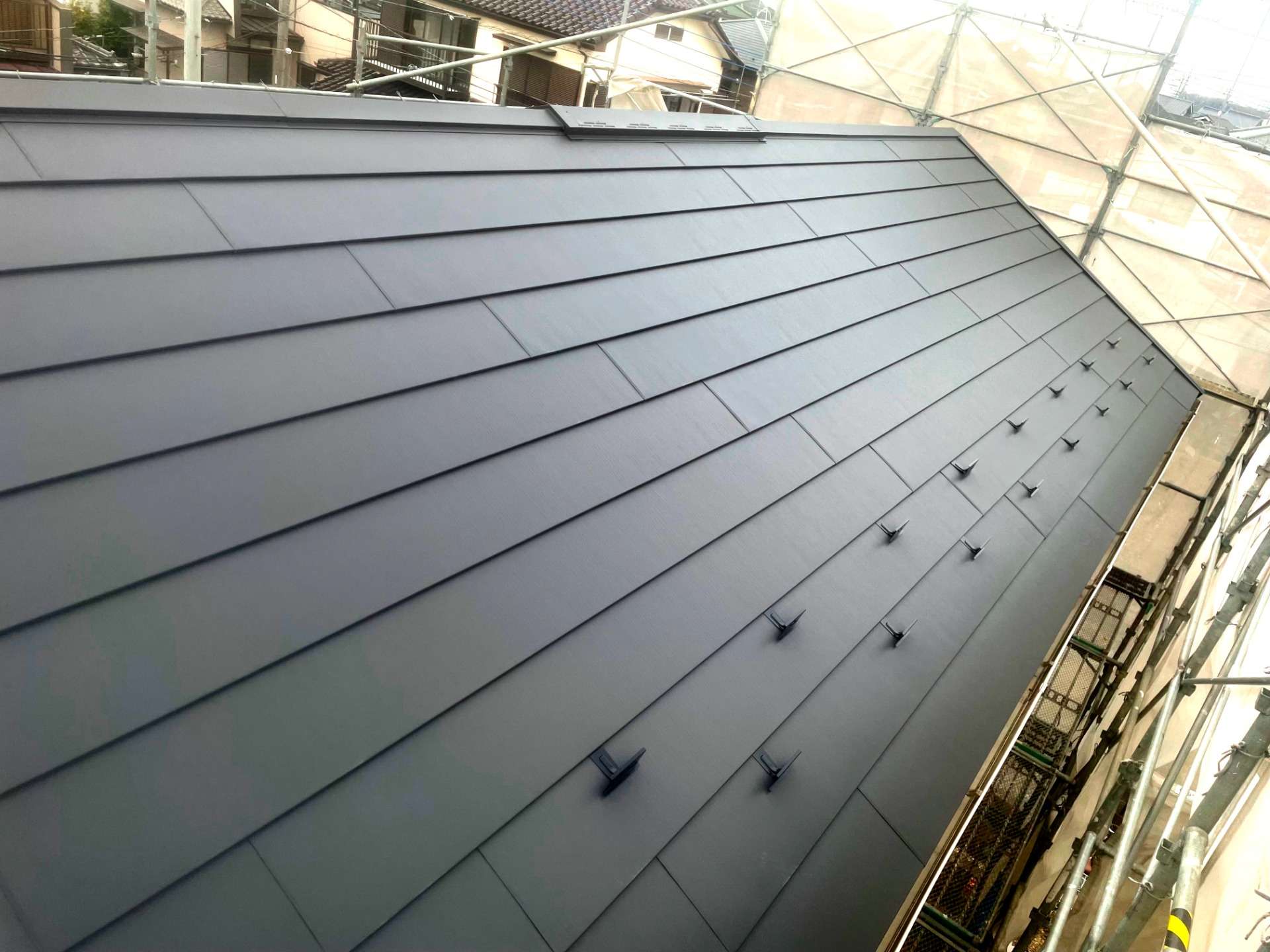 採用いただいた「スーパーガルテクト フッ素」は、国内でも高耐久で知られるガルバリウム鋼板の屋根材。