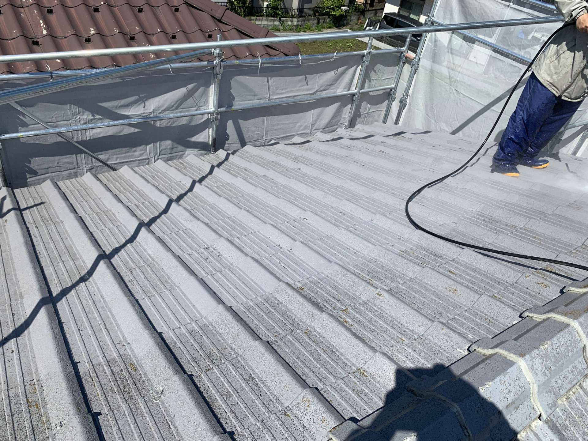 モニエル瓦屋根の劣化した表面部分を、高圧洗浄で丁寧に取り除くことの重要性や、強化シーラーという特殊な下塗り材を使わないと塗装が剥がれるリスクがあることなどを、写真を交えながらわかりやすくお伝えしました。